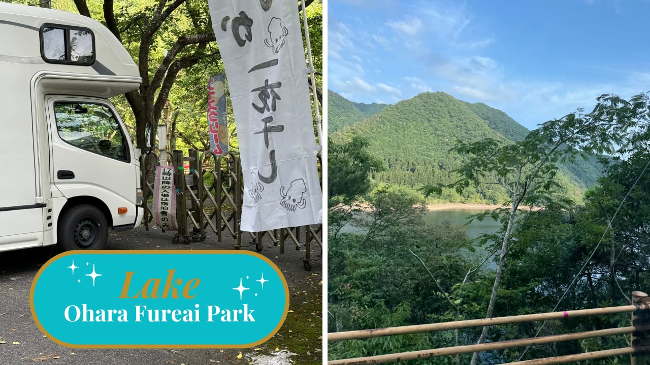 The drive to our next campsite at Lake Ōhara Fureai Park was stunning but stressful — think narrow mountain roads and a motorhome that barely fit. By the time we arrived, the gates were locked for the night. Thank goodness for Airbnb — we found a cosy spot in Shūnan to rest instead.